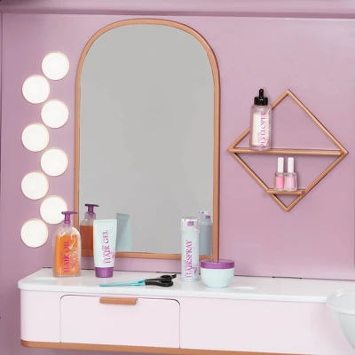 Make pretend-play styling fun with this Our Generation Hair Salon Playset for 18″ Dolls. Fold open the trailer and invite your customers for fun hair makeovers. Shampooing your dolls is sure to be a whole lot of fun when youโre at the washing station as the sink hose extends. You can even light up the mirror as you create fun looks with the hairbrush and curling iron. The shelves and opening drawer come handy for keeping accessories tidy and allows for a quick cleanup. This playset comes with 3 hair clips, hair dryer, 4 pretend nail polish bottles, hair pick, brush, a curling iron, comb, scissors, mirror, 3 dye tubes, shears, nail brush, towel, magazine, a chair and 9 hair care items. When it’s time to travel, just fold the trailer and off you go. (Dolls sold separately)