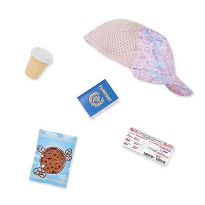 - Includes: 18-inch doll, outfit, cap, rolling luggage, passport, boarding pass, travel mug, and a bag of pretzels.
